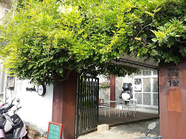 走進去有個優閒感覺的庭院,幾張桌椅慵慵懶懶地坐在木板上。