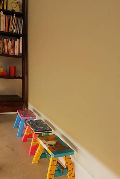書櫃旁邊有幾張小椅子,繽紛的色彩看了心情就雀躍起來。