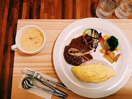 配餐的湯是玉米濃湯,濃郁好喝,沒有負擔!放在止滑的原木盤上整個呈現出田園的感覺。